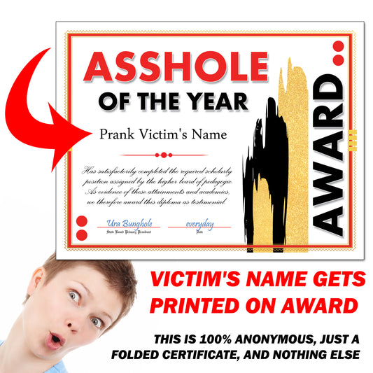 Asshole of the Year Certificate Award Prank Mail Letter