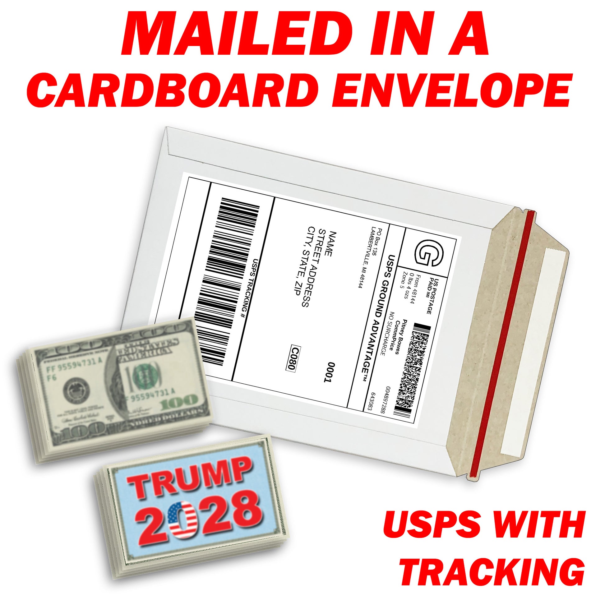 These Trump 2028 fake money bills are beautiful, and from a distance, they really do appear like real money. With a fake $100 on the outside, and a Trump 2028 on the inside, you'll get your point across quick (and instantly set some people off). HA! Plant them everywhere you go and watch their reaction when people grab the bill thinking it's real, and read TRUMP 2028!