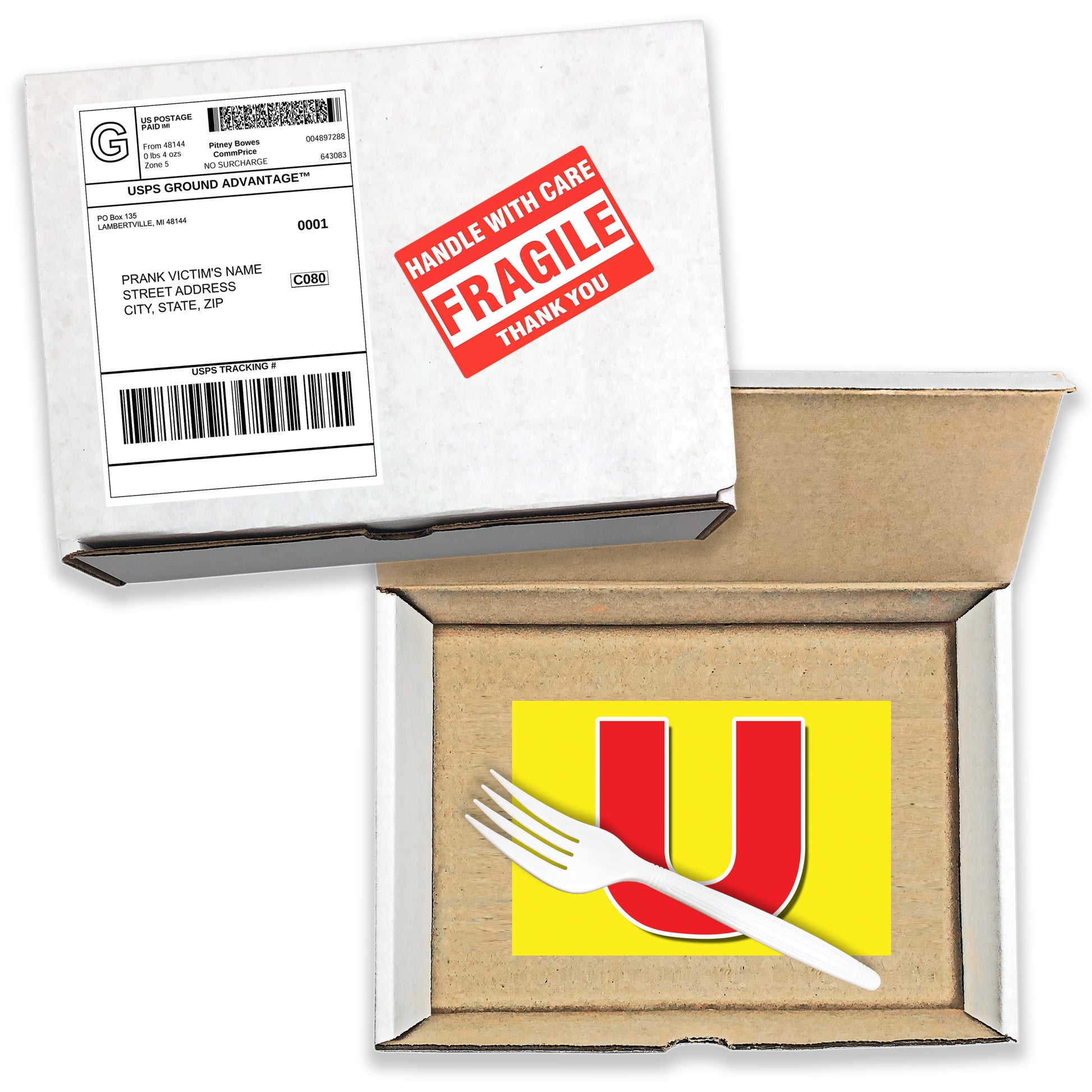 It all looks innocent enough from the outside (FRAGILE sticker), that is, until they open the box. HA! Inside the box is a plastic fork, and a prank label (U)... SURPRISE!