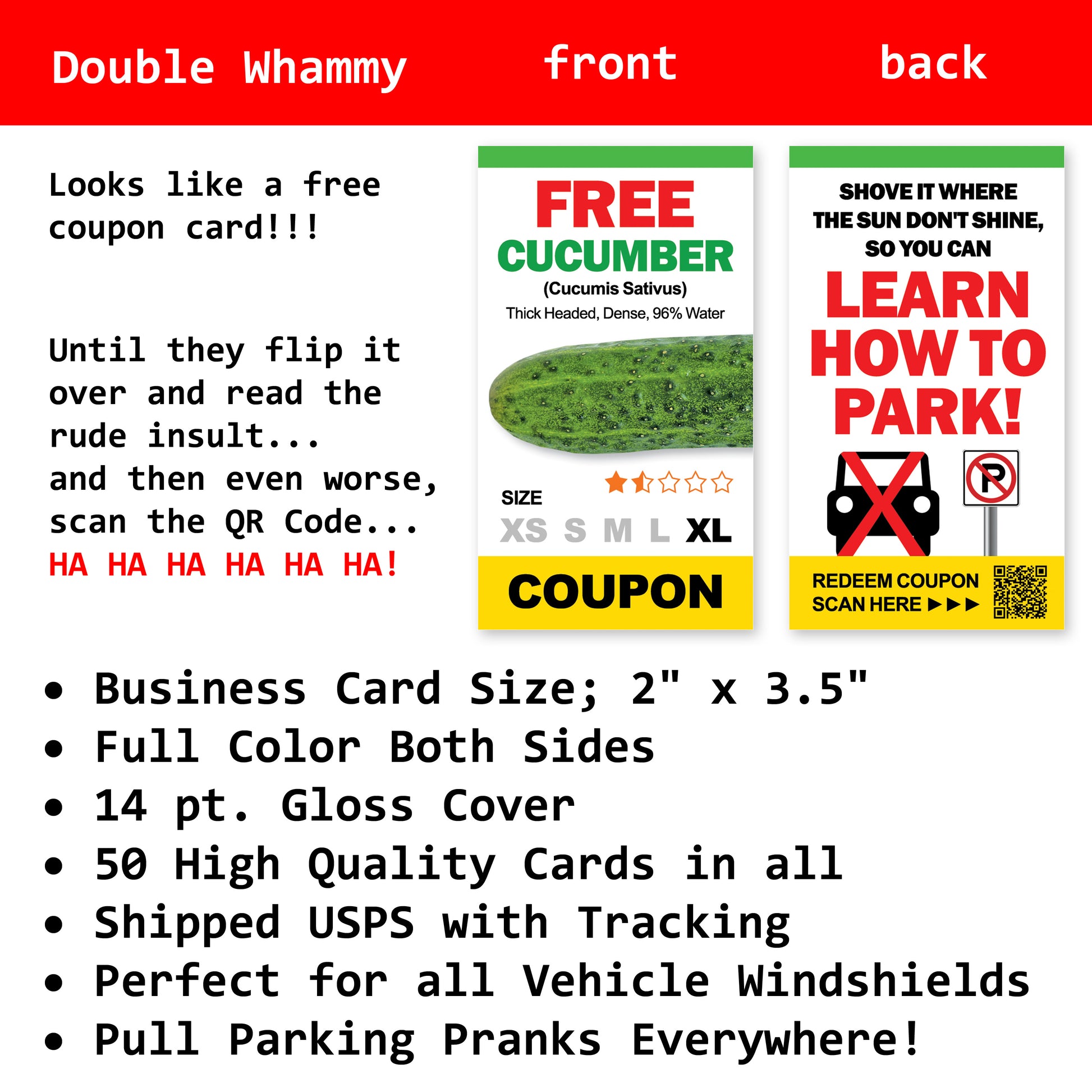 These Cucumber Learn How To Park bad parking cards are colorful and fun. Place one on a windshield of bad drivers or parkers and watch their reaction when they grab the card and see the XL cucumber coupon. HA HA! And when they flip it over, they read "Learn How To Park!" HA! And then, when they scan the QR Code, they'll be hit with the loudest woman orgasm ever. Totally mortifying and totally worth it.
