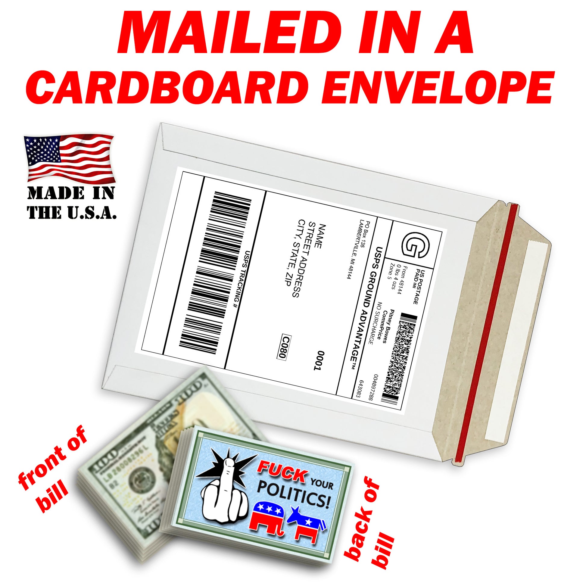 These Fuck Your Politics fake money bills (slightly smaller than real money) are beautiful, and from a distance, they really do appear like real money. With a fake $100 on the outside, and Fuck Your Politics with a middle finger and political symbols on the inside, you'll get your point across quick (and instantly tick some people off). HA! Plant them everywhere and watch their reaction when people grab the bill thinking it's real, and read what everyone is thinking: Fuck Your Politics!
