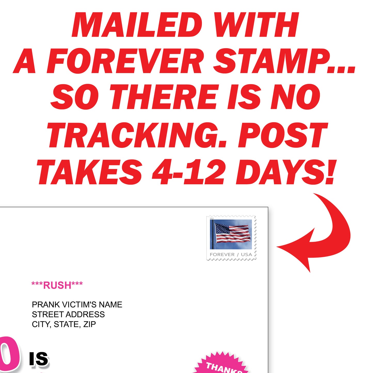 It's a cheap, hilarious prank, that's mailed with a USPS stamp (meaning no tracking). The post office generally take 4 -12 days to deliver. So sit back and wait for the laughter to begin. Your victim will have no idea who sent it (and we'll never tell). It's 100% anonymous. It's sent as-is (as shown), with no way to connect you to the prank at all. Bah ha ha ha ha!