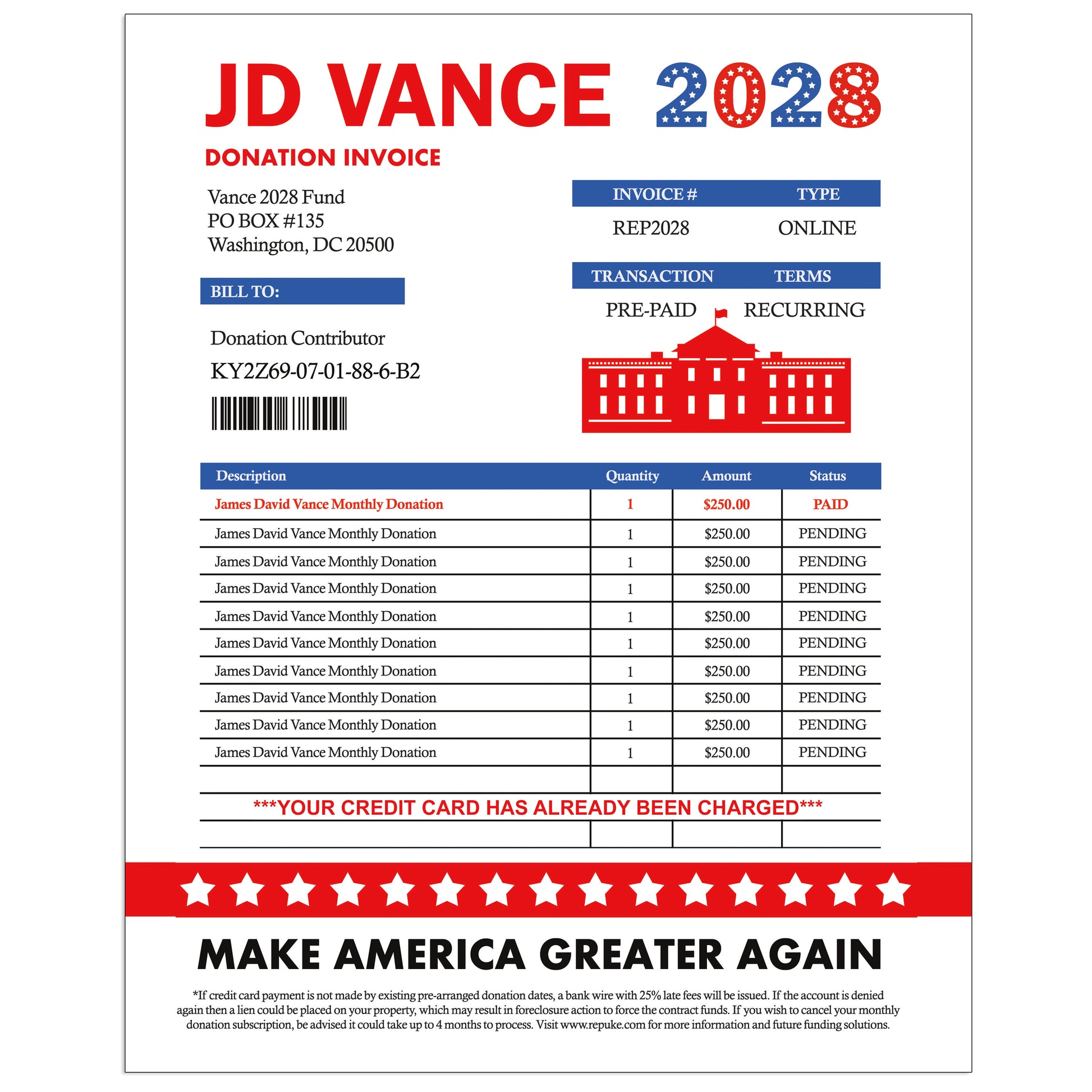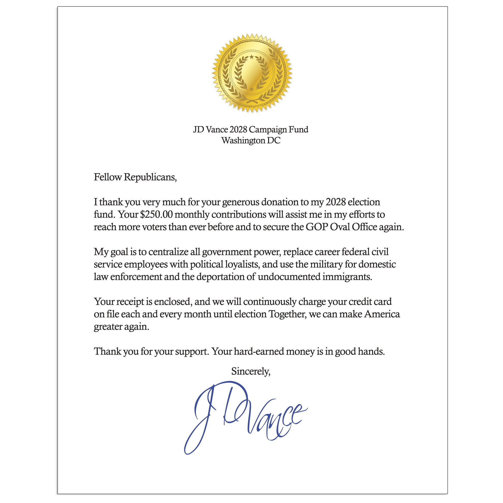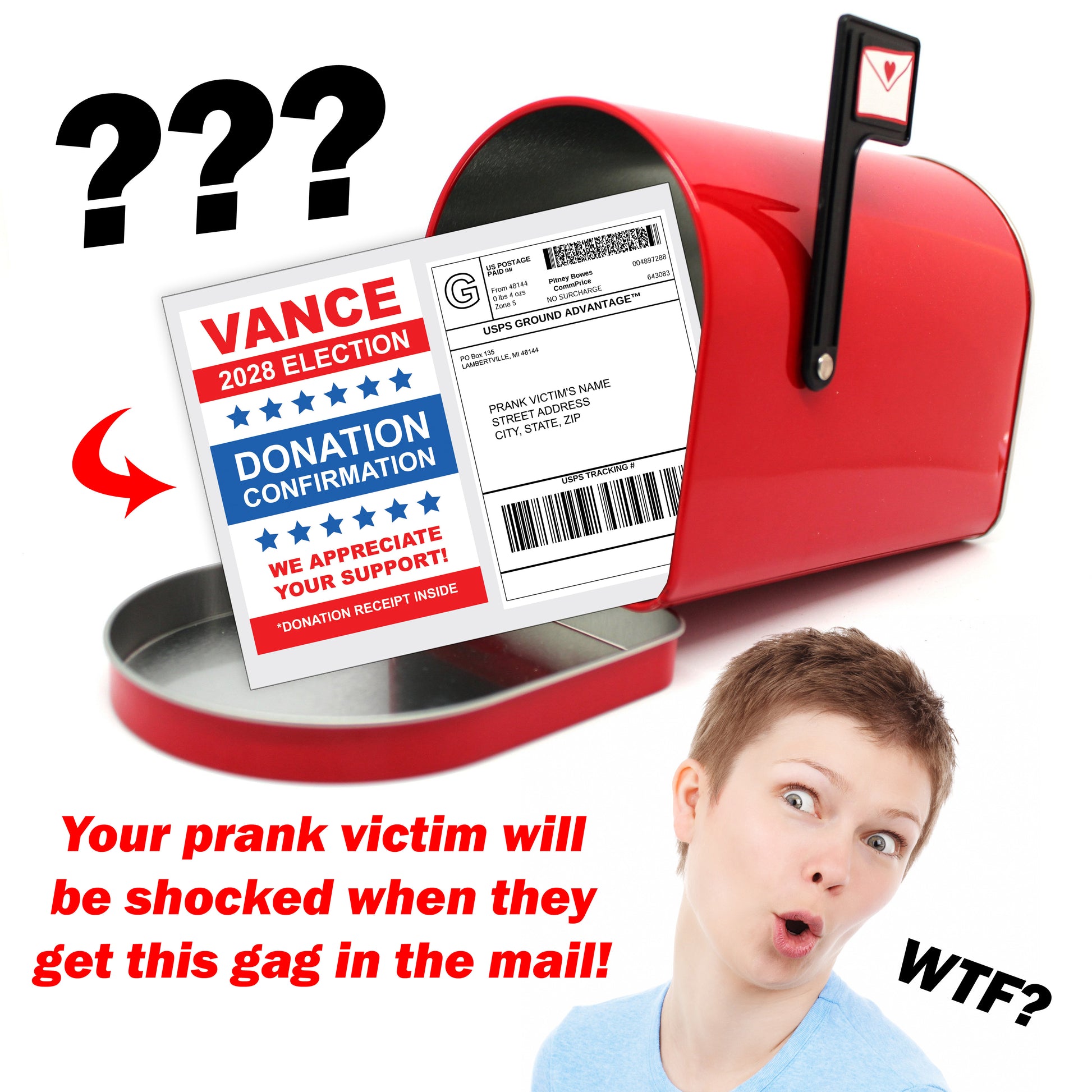 Mail a totally rude and fake JD Vance 2028 Election Donation Confirmation letter directly to your victims; anonymously!