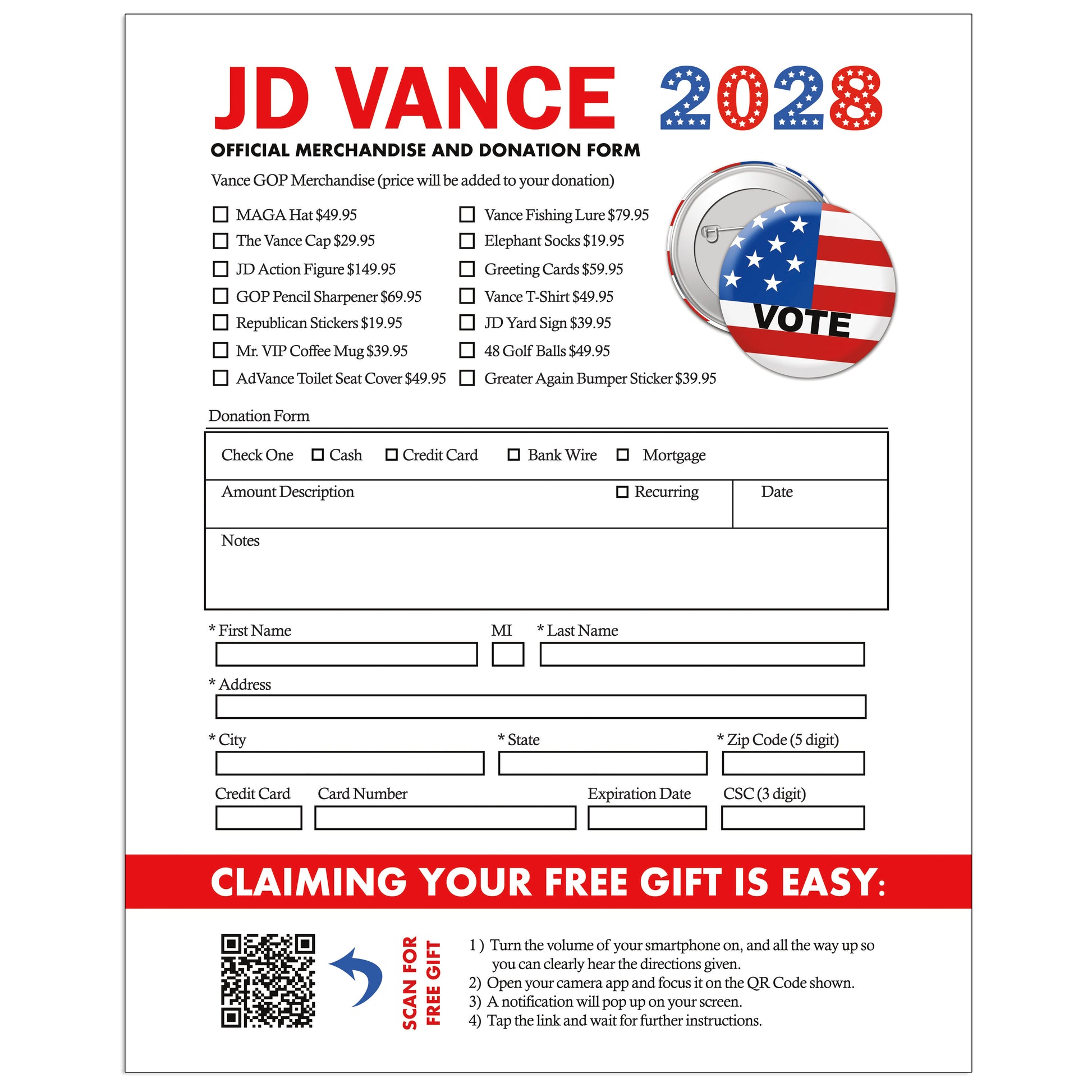 JD Vance 2028 Fake Election Donation Prank Packet Mailer!