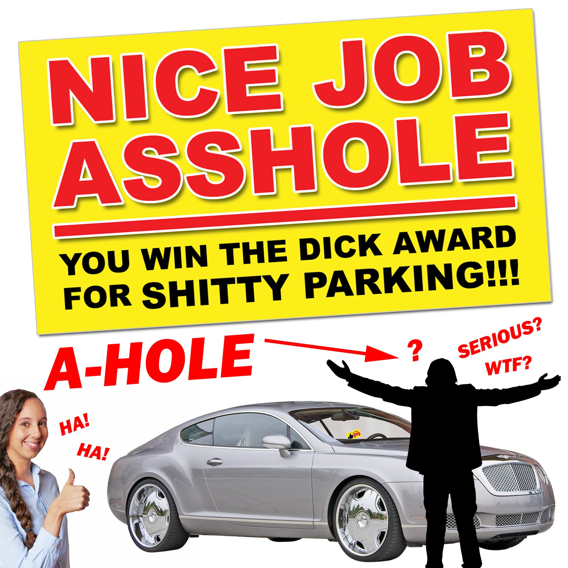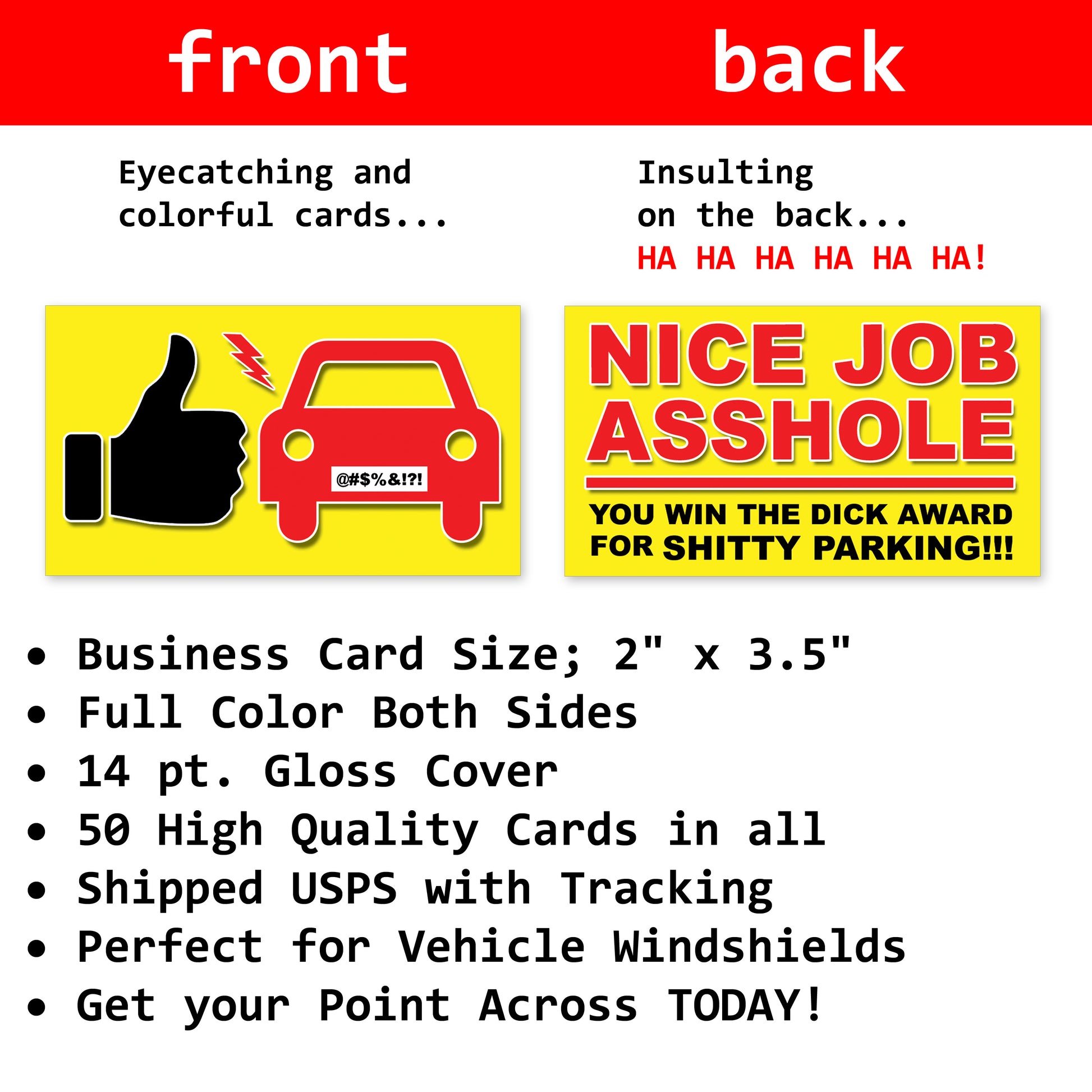 These nice job asshole parking cards are colorful and fun. Place one on a windshield of bad drivers or parkers and watch their reaction when they grab the card and read "Nice Job Asshole - You Win the Dick Award for Shitty Parking" HA!