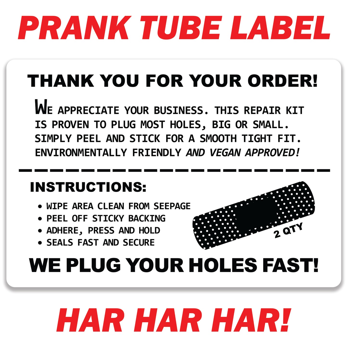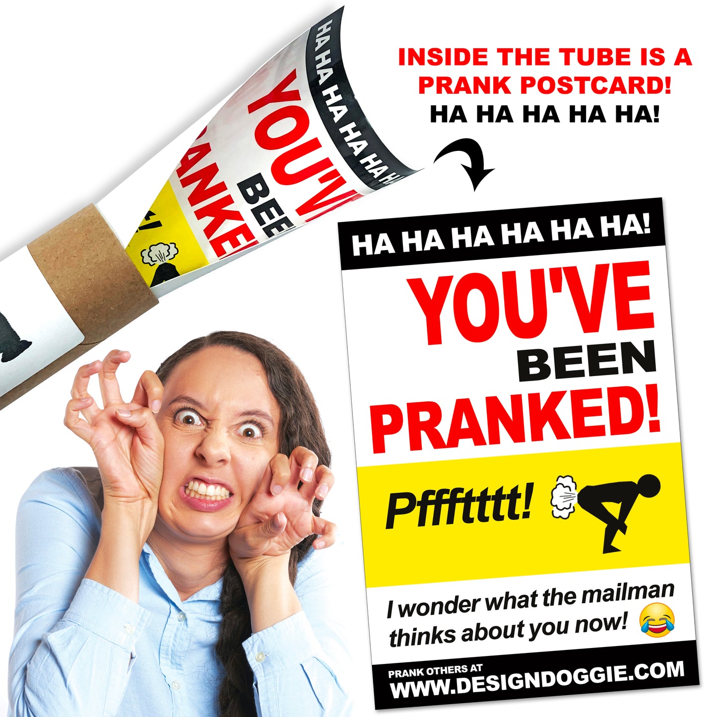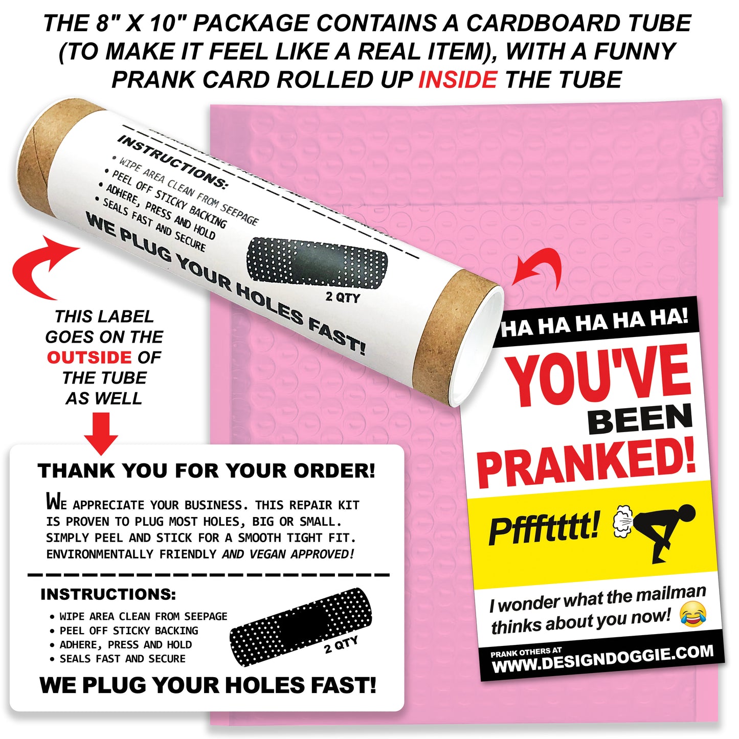 Inside the bubble mailer is a cardboard tube (so it feels like a real item) with another prank label on the outside of that, and a prank card inside that reads "You've been pranked!"