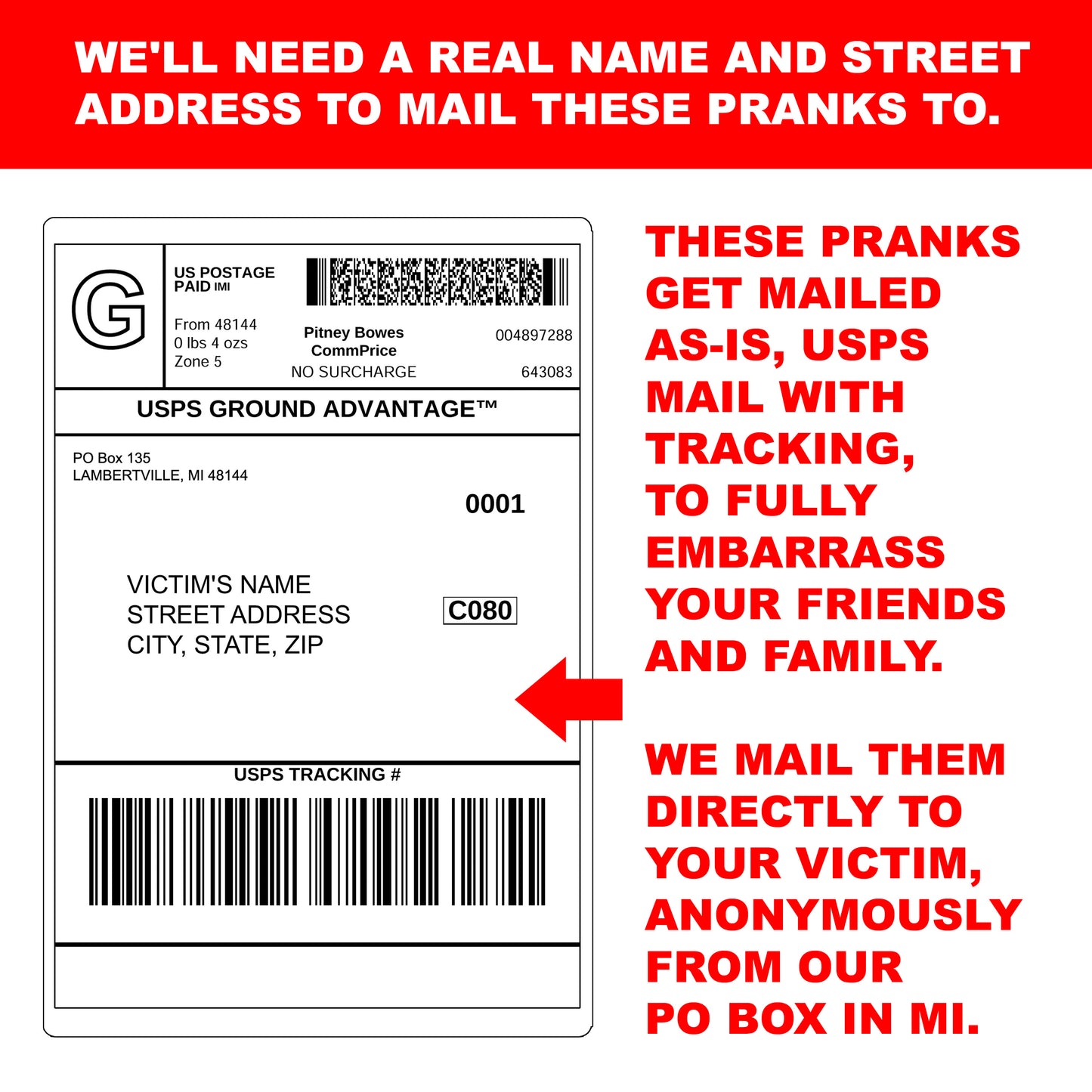 We'll mail this completely anonymously from our PO Box in Michigan, with no invoice, receipt, or packing slip, directly to your victim! They'll never know who sent it, unless you confess! (and we'll never tell)