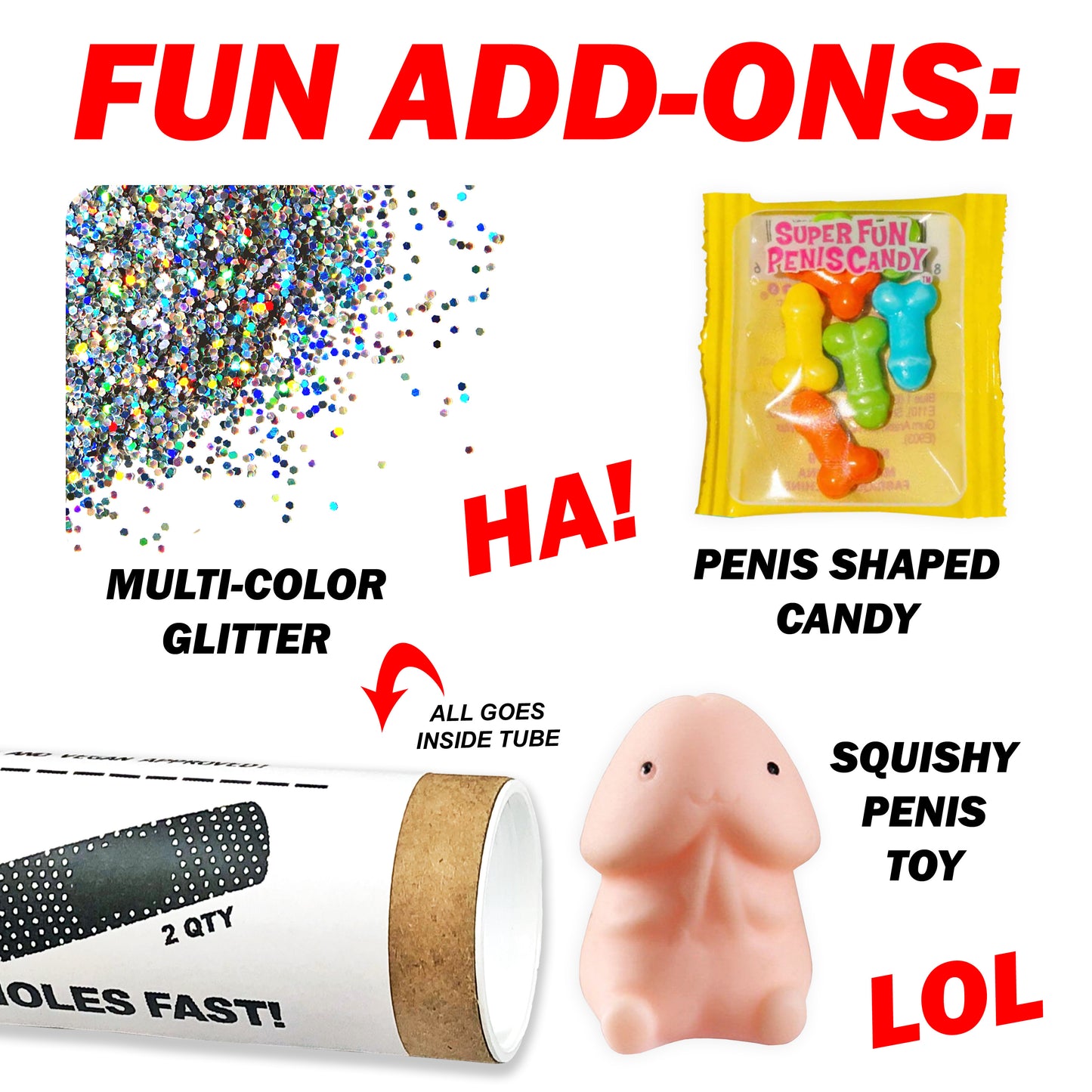 Include some fun add-ons inside the tube as well: squishy penis toy, penis shaped candy, and of course, GLITTER! So, so wrong!!!