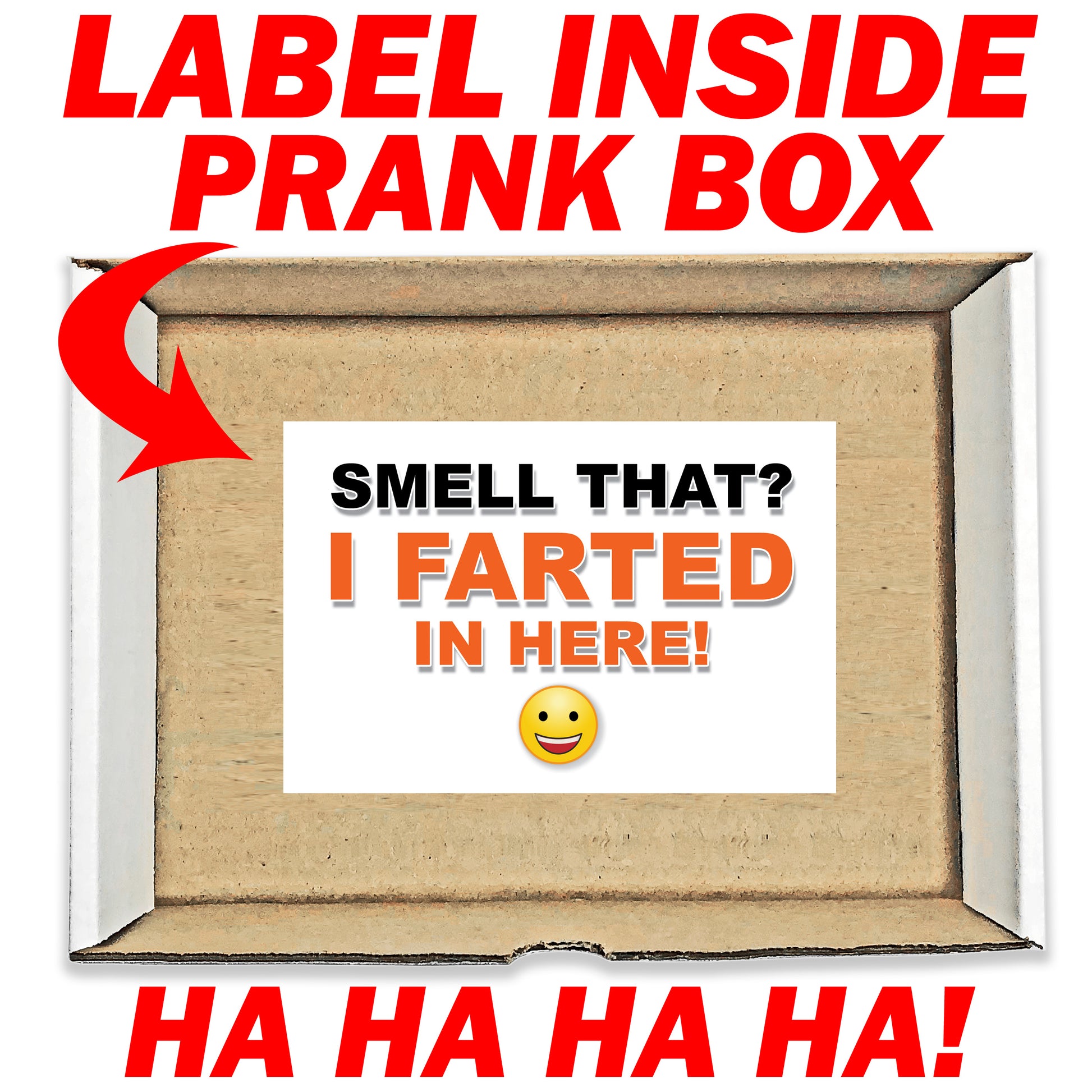 It all looks innocent enough from the outside (FRAGILE sticker), that is, until they open the box. HA! Inside the box is a prank label (Smell That? I Farted in Here!)... SURPRISE!